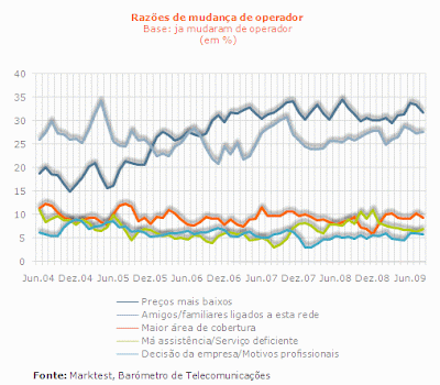 Embora a grande maioria dos portugueses, 73.9%, diga nunca ter mudado de operador, os que o fazem são motivados pelo preço, razão apontada por 31.7% deles. A comunidade de contactos (o facto de familiares ou amigos estarem ligados à nova rede) motiva 27.7% dos que mudam de operador. Estas duas razões representam 59.4% do total apontado por quem diz já ter mudado de operador. Outras razões, como a maior área de cobertura ou a má assistência ou serviço deficiente, recebem menores referências (9.4% e 6.9%, respectivamente).