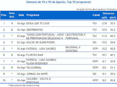 Televisão: Jardim no "top ten" e "For do Mar" desce