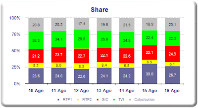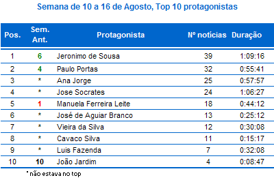 Relativamente à semana 33 deste ano, são os seguintes os indicadores estatísticos da televisão - Alberto João Jardim aparece em 10º entre os protagonistas das notícias e a telenovela da TVI "Flor do Mar", filmada na Madeira, desceu algumas posições (fonte: Marktest.com, Agosto de 2009)